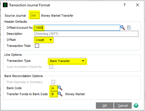 Note: MM is the journal for the Money Market Transfer. To create or modify the default settings for source journals, click Format. Please review the settings for the MM journal at the end of this article, so you can ensure that your source journal follows the proper default behavior.