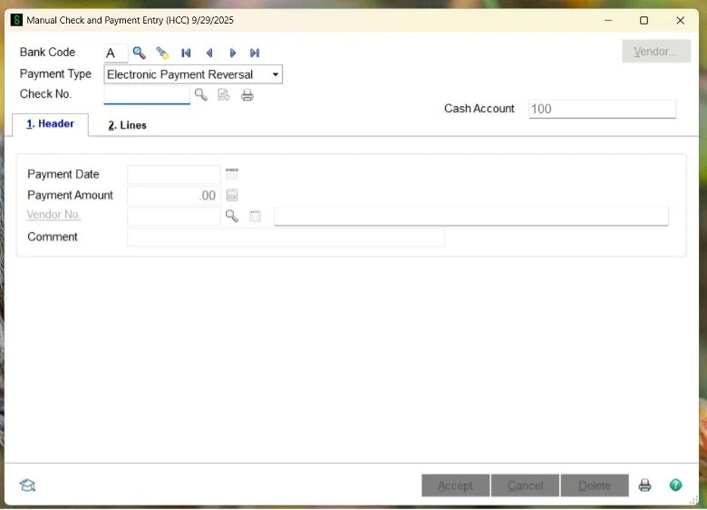 This procedure is fast and easy. All you have to do is open the Manual Check and Payment Entry screen, fill in a few fields, answer a prompt, and click Accept to save your changes.